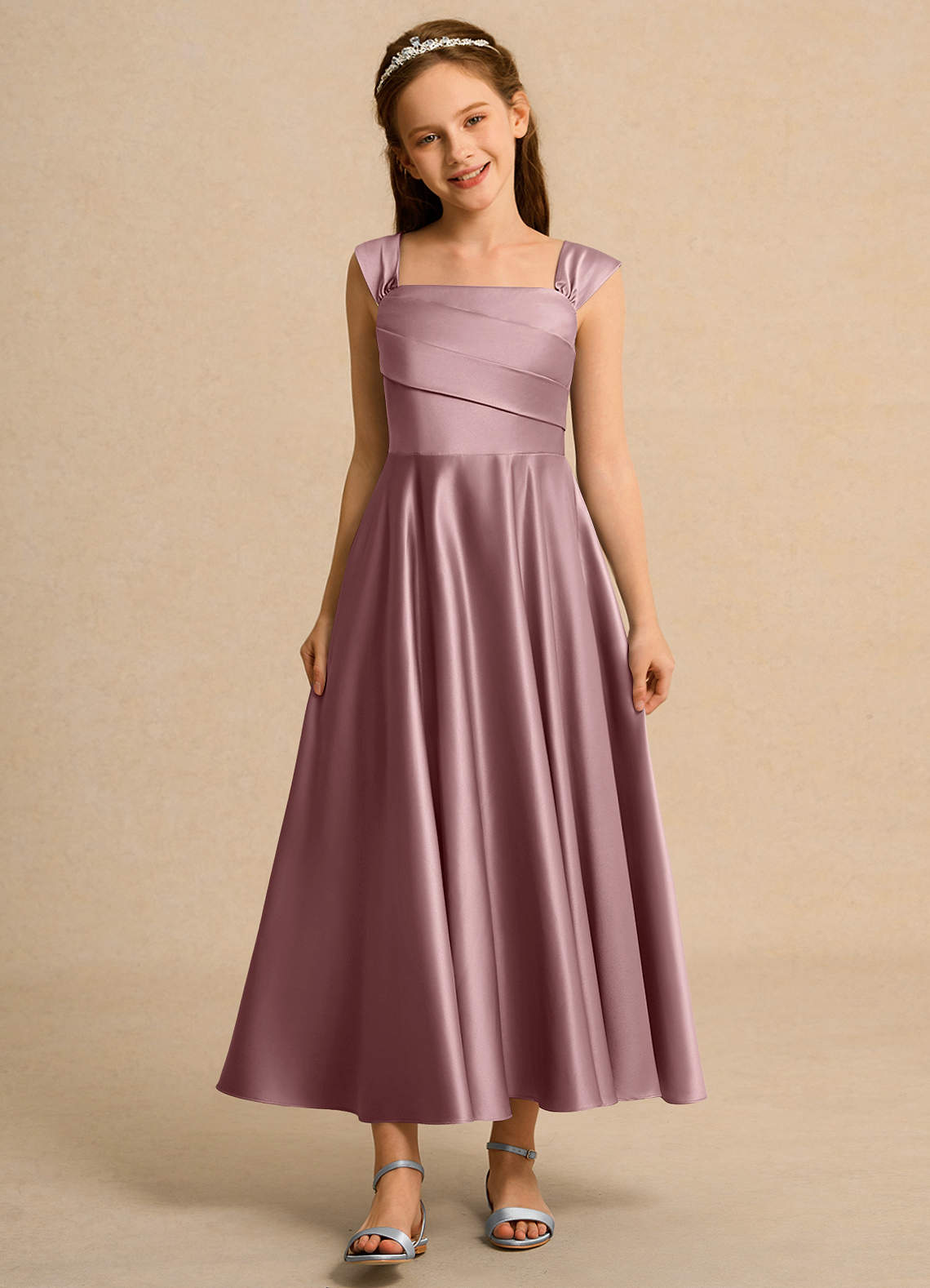 Abito A-Line in Raso Opaco Plissettato Rosa Polverosa