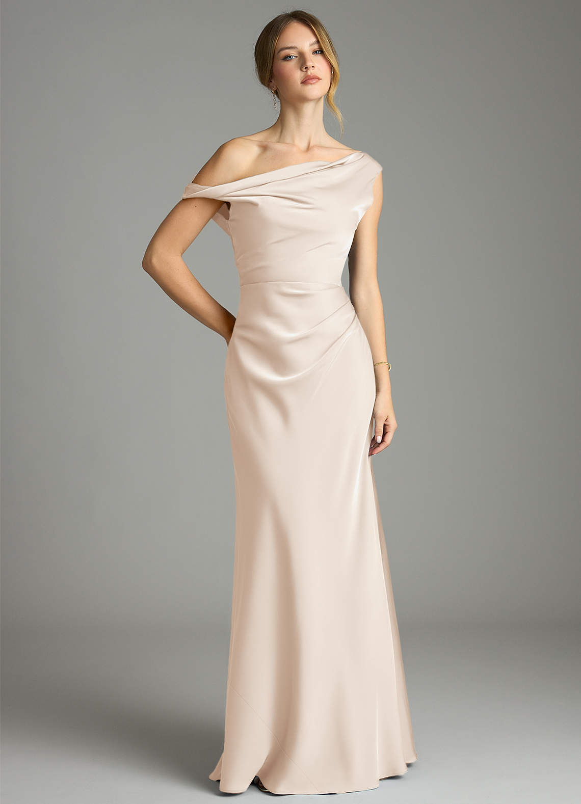 Abito Sirena in Raso Elasticizzato a Spalla Scoperta Alabastro Bianco