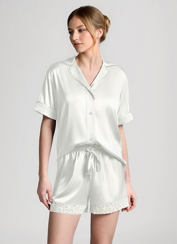 화이트 새틴 레이스 장식 반팔 잠옷 세트
