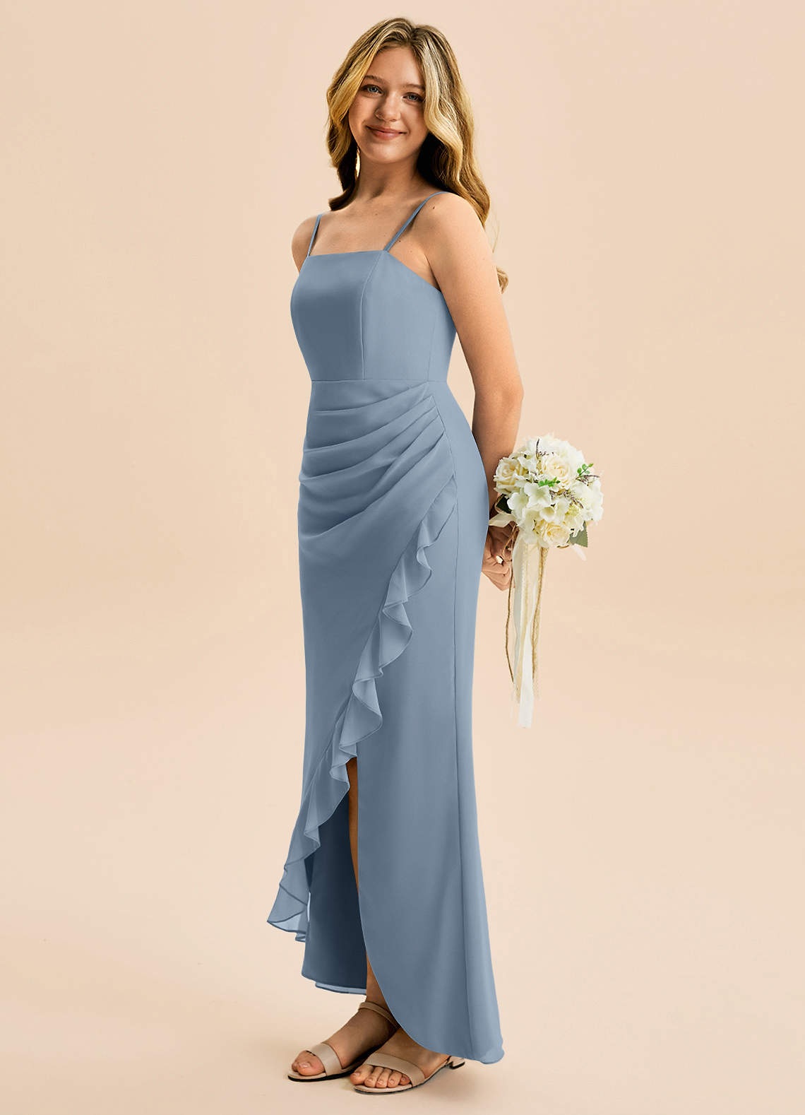 쉬스 주름진 쉬폰 플로어 길이 주니어 신부 들러리 드레스
