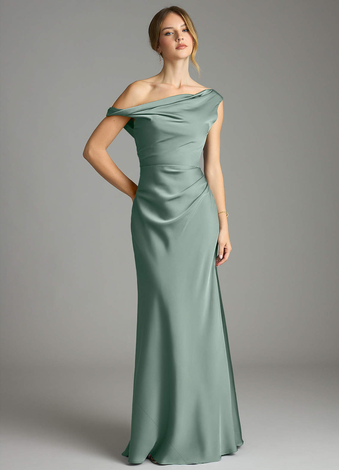 Silver Sage Mermaid Off the Shoulder Stretch Satin Dress