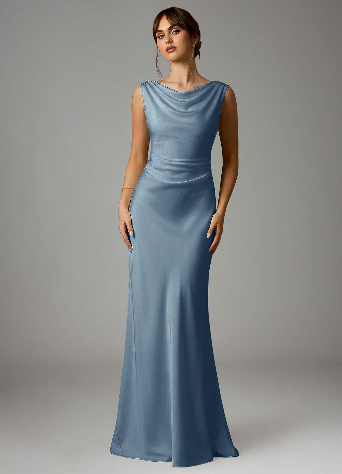 Dusty Blue Mermaid Pleated Stretch Satin Dress