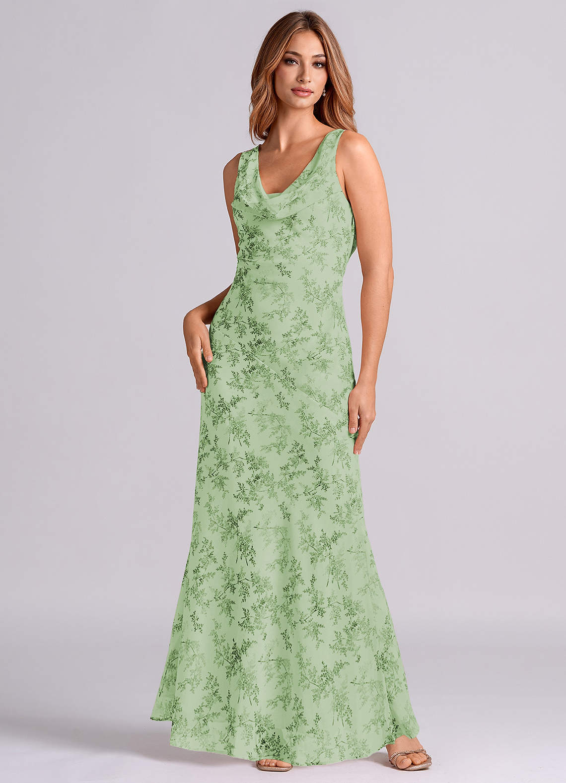 Green Fern Floral Mermaid Pleated Chiffon Dress