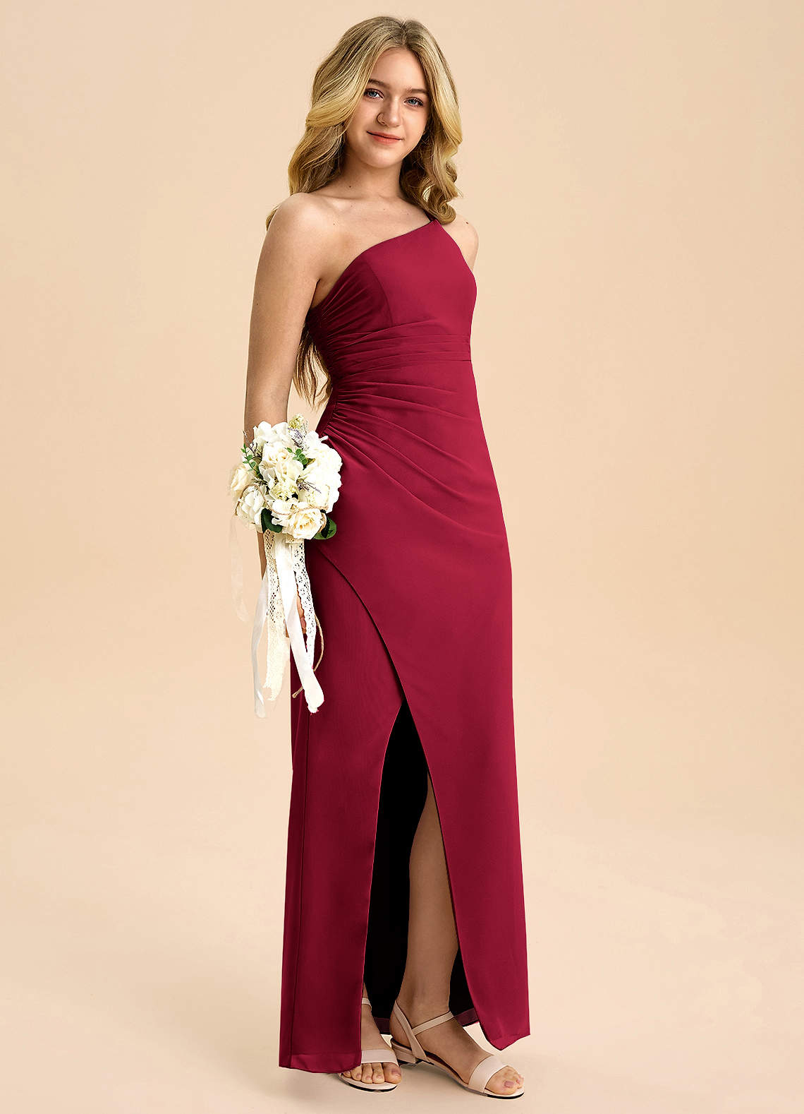 Vestido Borgonha de Chiffon de Linha A com Plissado