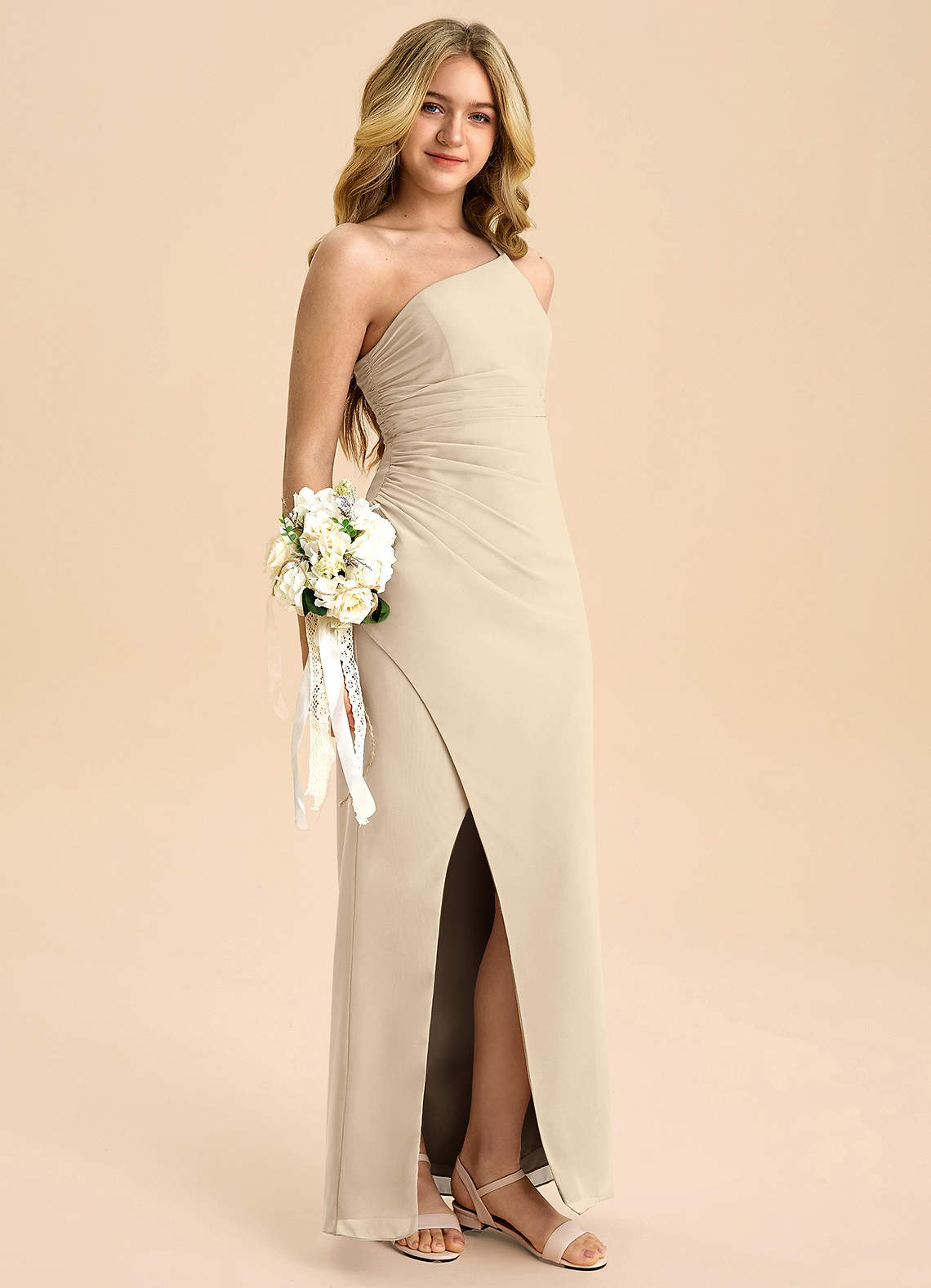 Vestido Champanhe de Chiffon de Linha A com Plissado